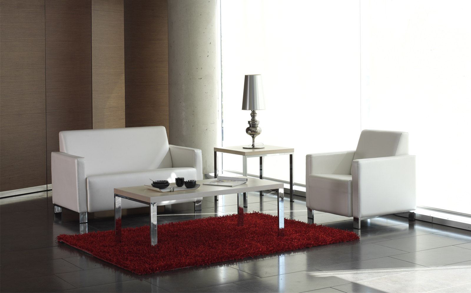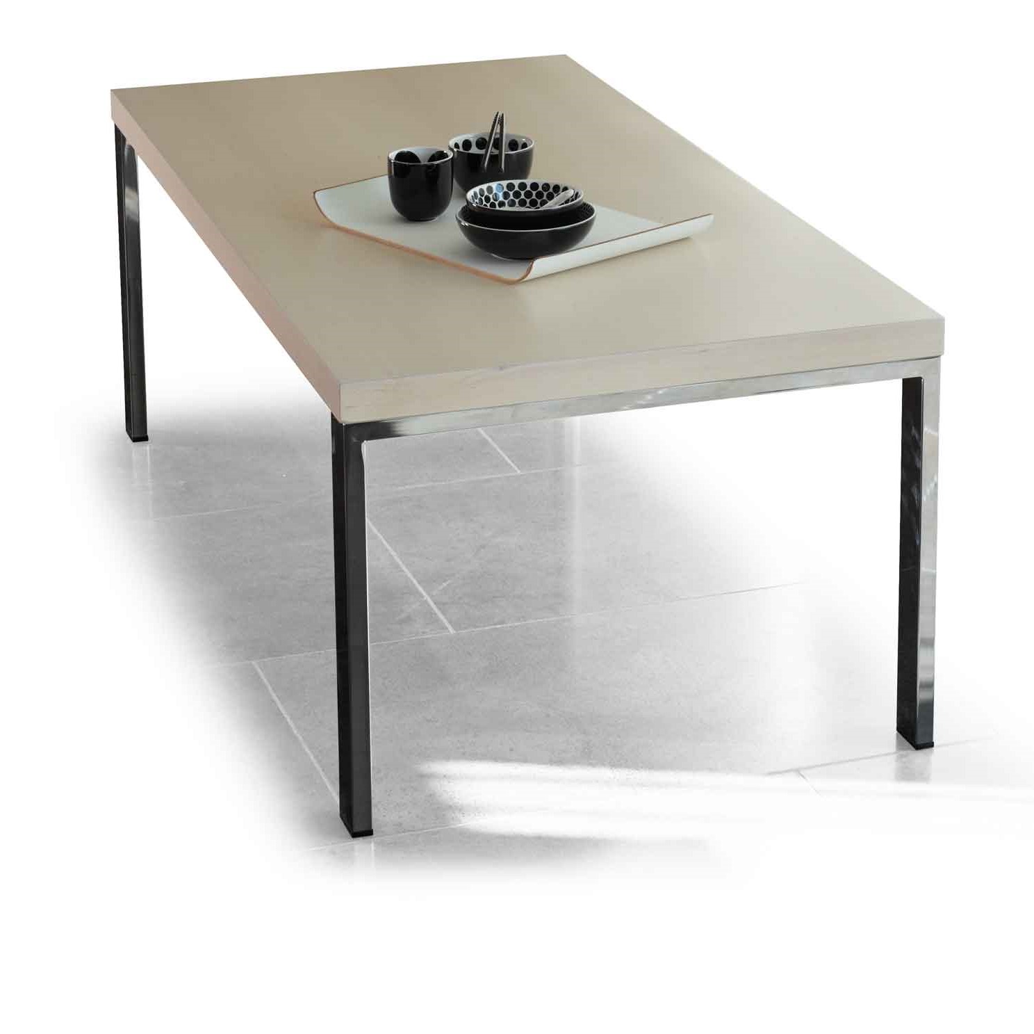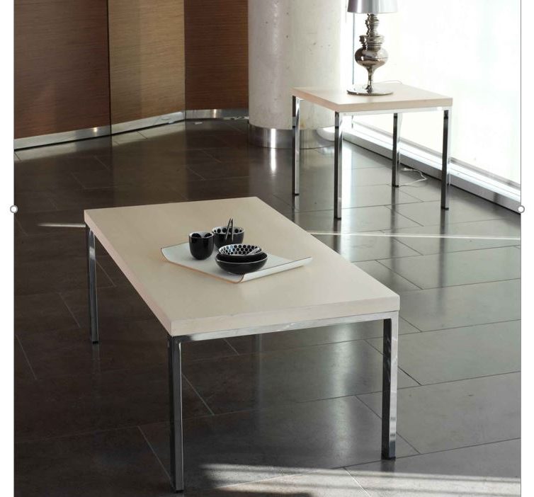 Colección de mesas auxiliares de centro y rincón. Patas de acero, con sección rectangular de 50×20 mm, colocadas en forma de “U” invertida. Tapa en tablero de 40 nn chapado en haya.